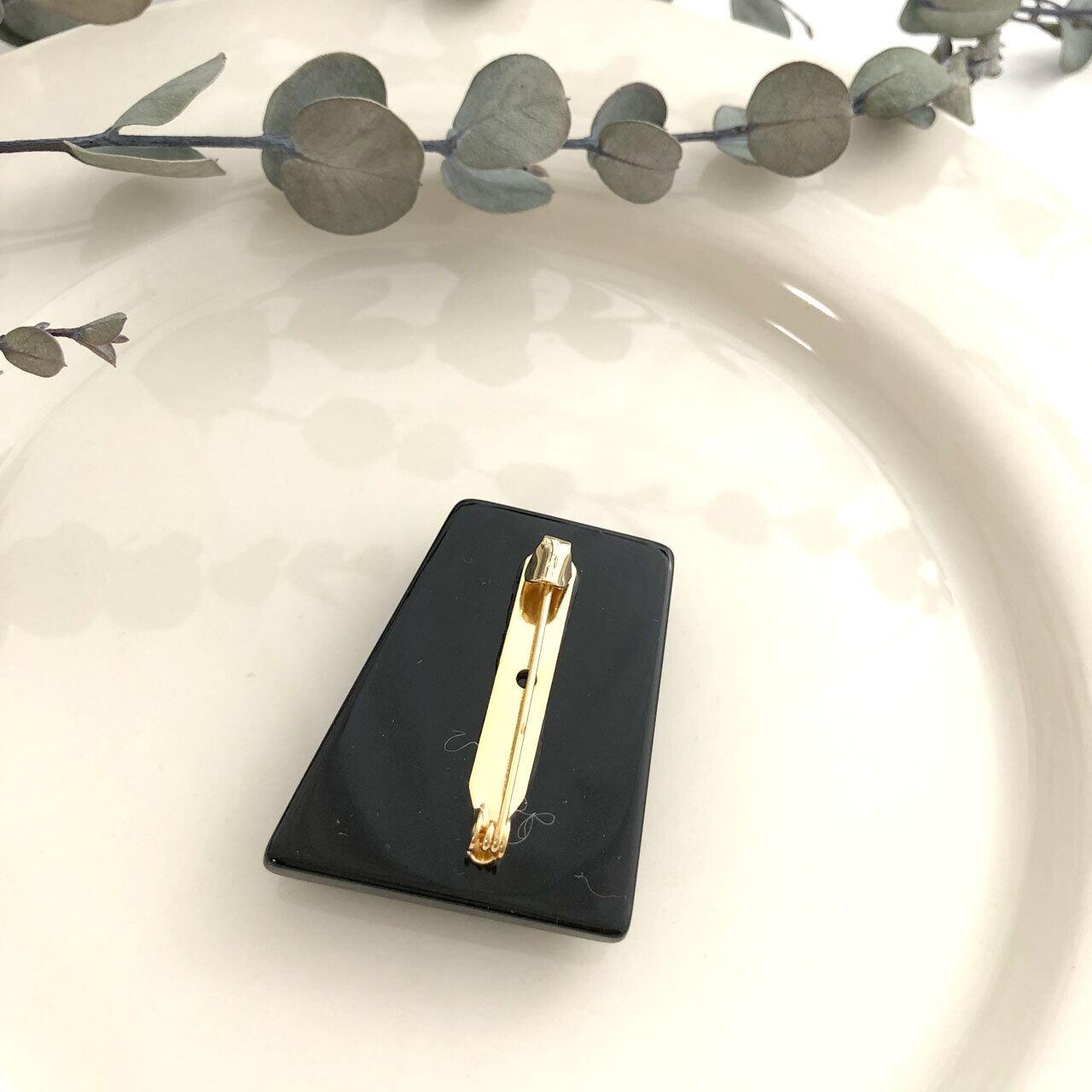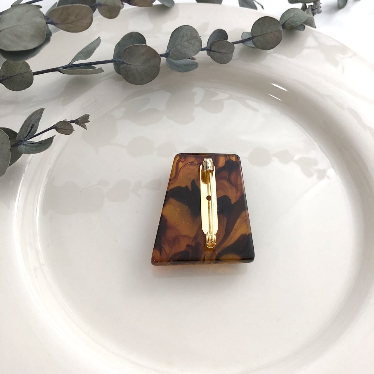 透明に金色銀色の箔が入ったアクリルとベーシックな黒、べっ甲のアクリルを組み合わせたブローチ。